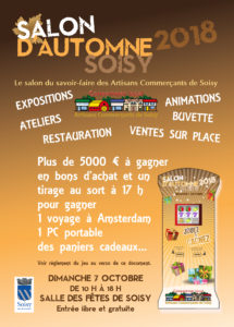 Nous avons le plaisir de vous informer que nous serons présents au salon d’automne des Artisans Commerçants de Soisy qui se tiendra le dimanche 7 octobre 2018, à la salle des fêtes de Soisy Sous Montmorency (16 avenue du Général de Gaulle), de 10h00 à 18h00.